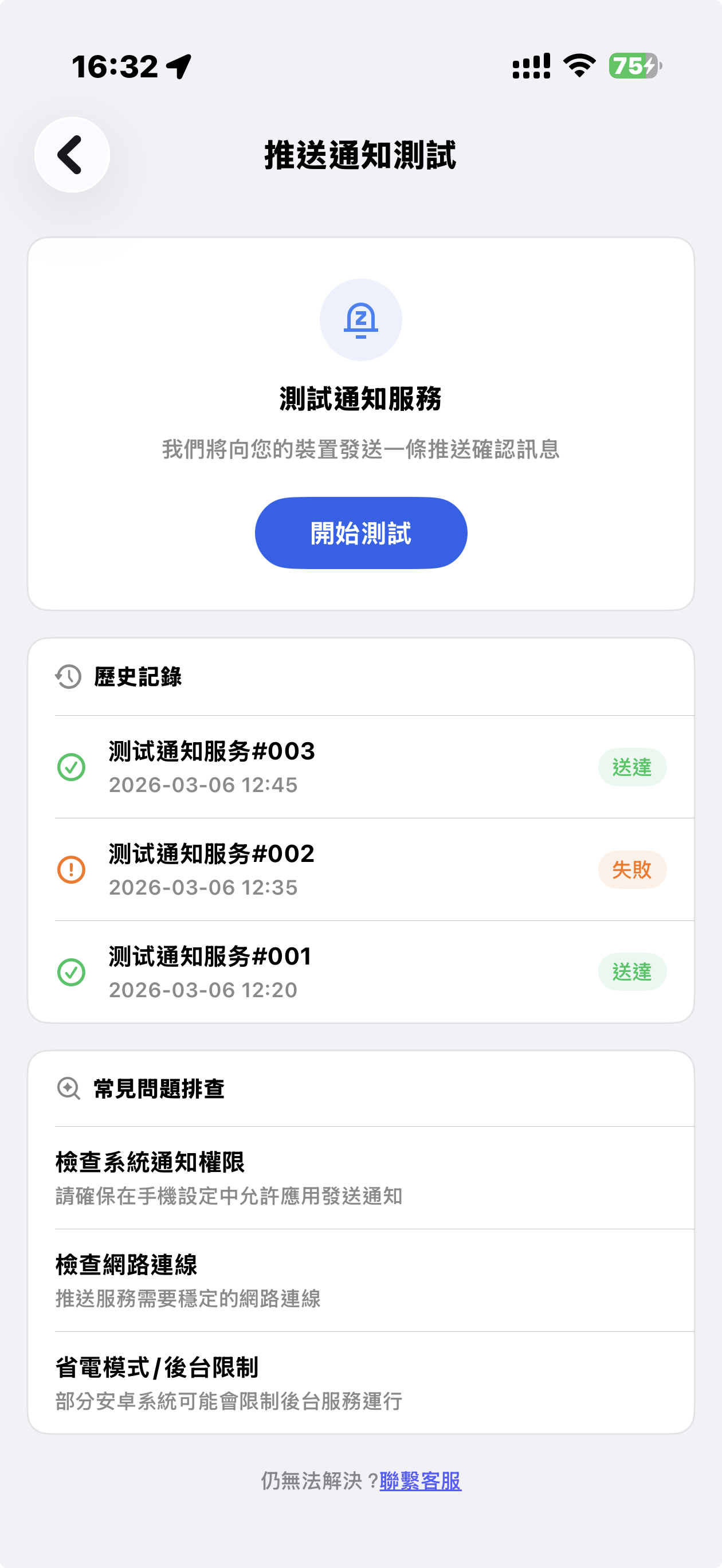 點擊“開始測試”後,係統會向您的設備發送一條測試通知,並顯示結果:
