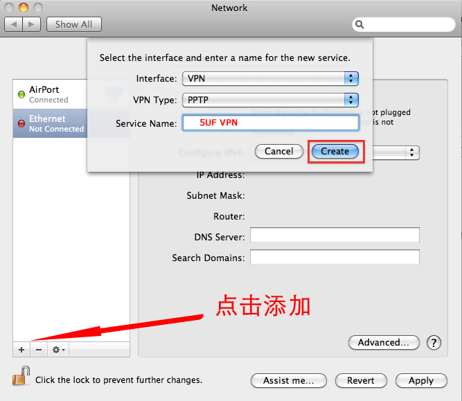 第四步: 在“接口”栏中选择“VPN”,在“VPN类型”栏中填入 “PPTP”,在“服务名称”中填入“无忧府VPN”,然后点击“创建”。